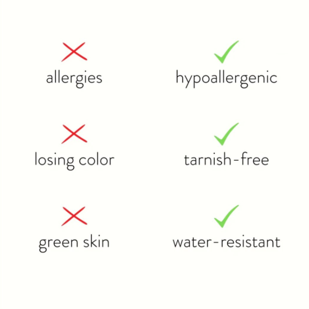 Hechas con materiales hipoalergénicos de alta calidad que no se decoloran ni manchan, nuestras joyas son perfectas para el uso diario. ¿Ducha, deporte o viaje? No hay problema — seguirán brillando sin importar el ritmo de tu día.